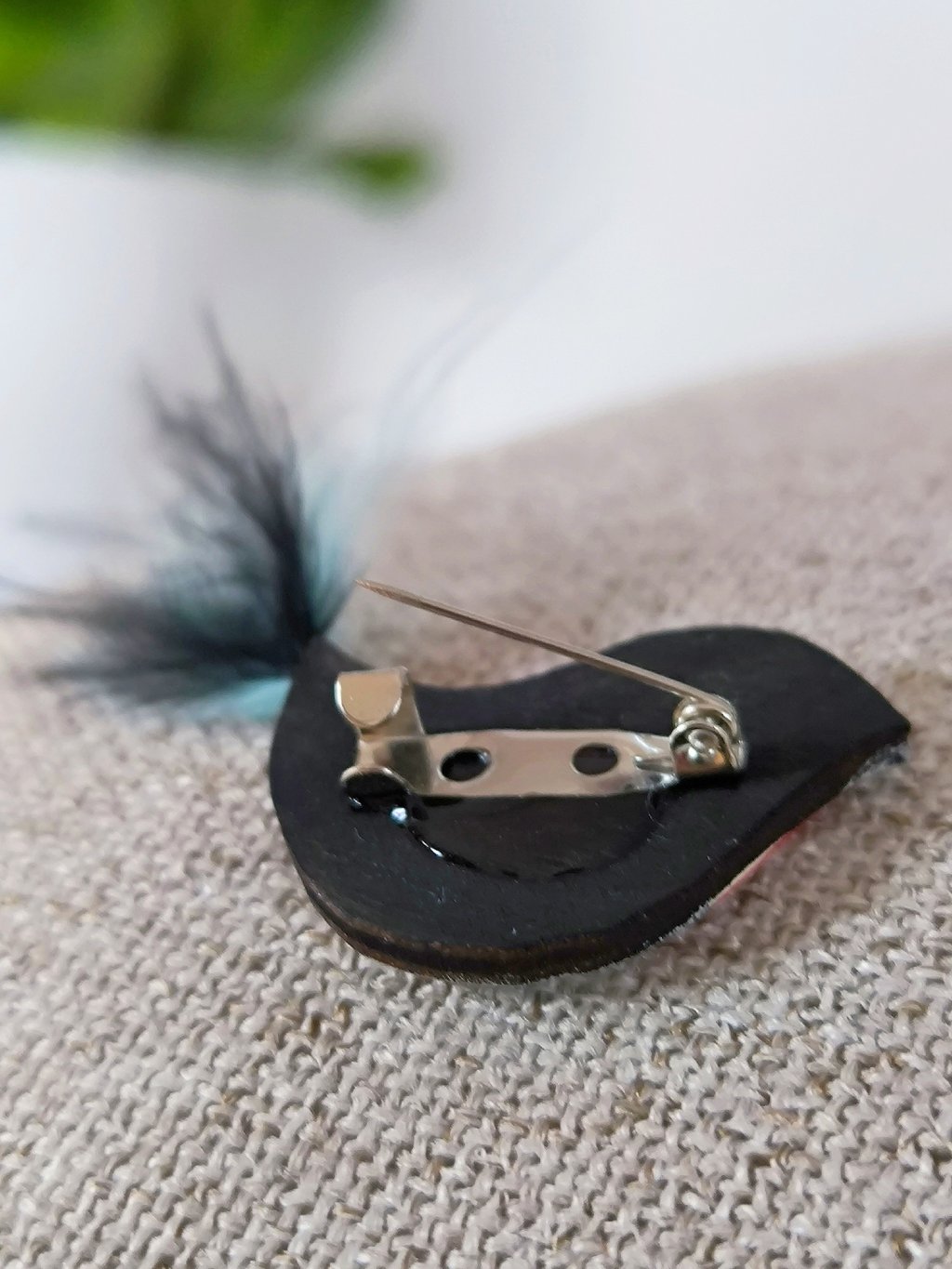 - Materiál: dřevěná překližka zalitá pryskyřicí, spona z chirurgické oceli, peří