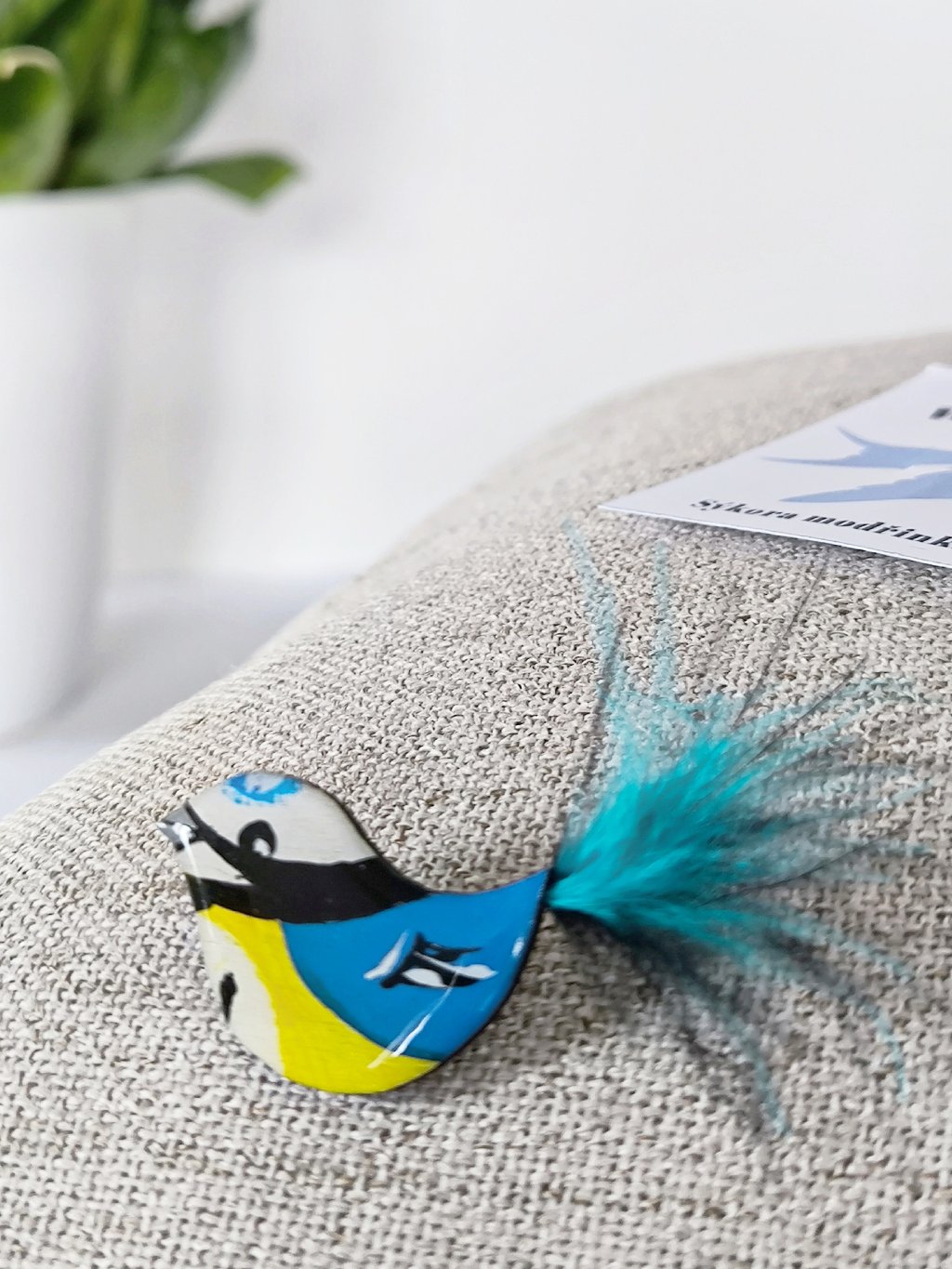 Jak vykouzlit z nudného roláku originální model? No přece originálním módním doplňkem, třeba ručně vyráběnou broží české výroby. Tato brož je inspirovaná sýkorou modřinkou (Cyanistes caeruleus) – malým hravým a nebojácným ptáčkem, kterého často vidíte v našich parcích a zahradách. Je talismanem radosti, vnitřní síly a lehkosti.