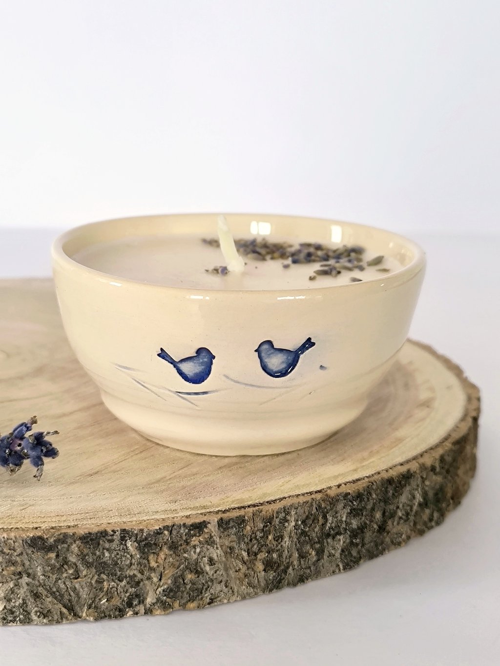 Keramická miska s jemným motivem ptáčků je vytočená na hrnčířském kruhu a dvakrát vypálená za vysokých teplot, což zaručuje její odolnost a kvalitu. Je zalitá sójovým voskem, který díky nižšímu bodu tání hoří déle, vypaluje se rovnoměrně čímž má delší životnost, produkuje méně sazí a škodlivých látek. Svíčka je bez parfemace.