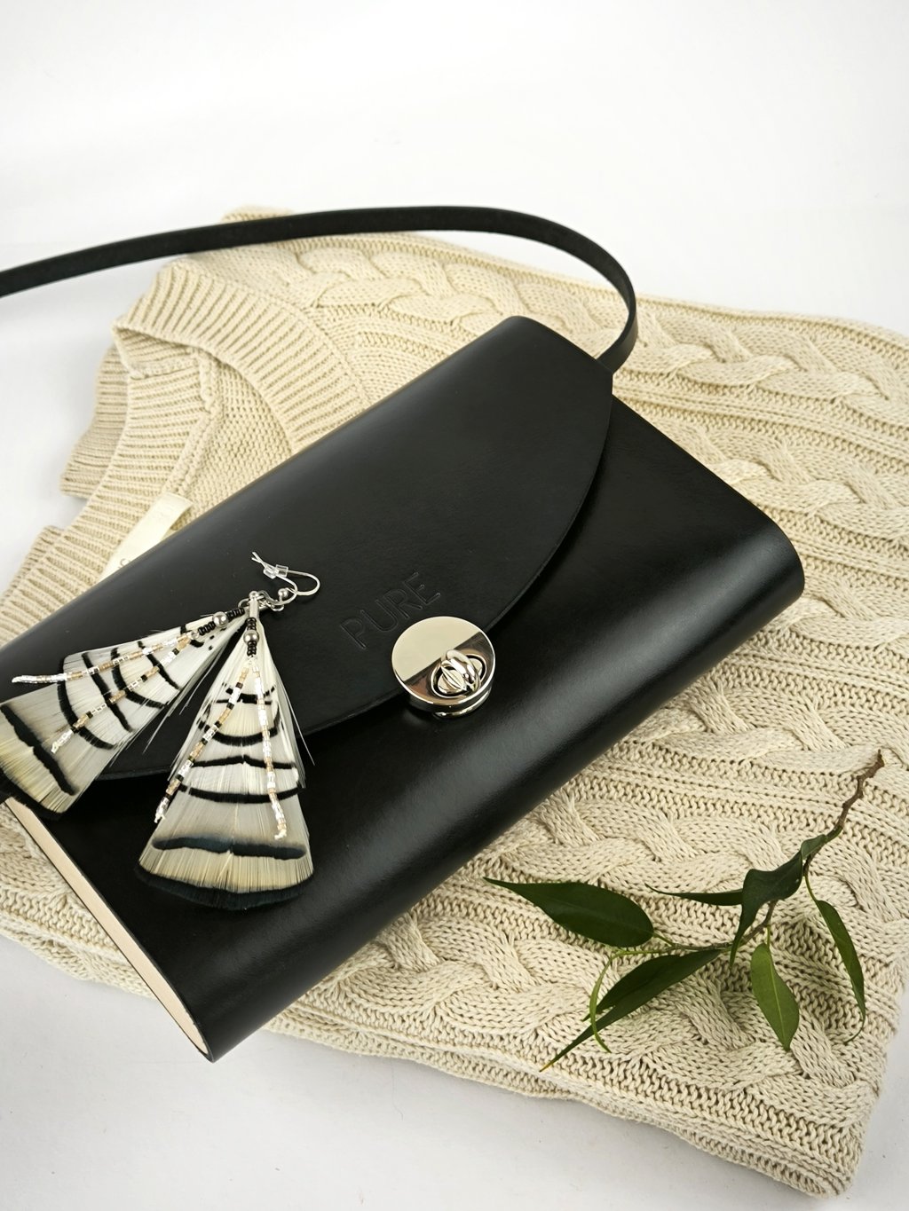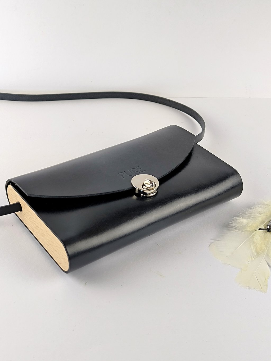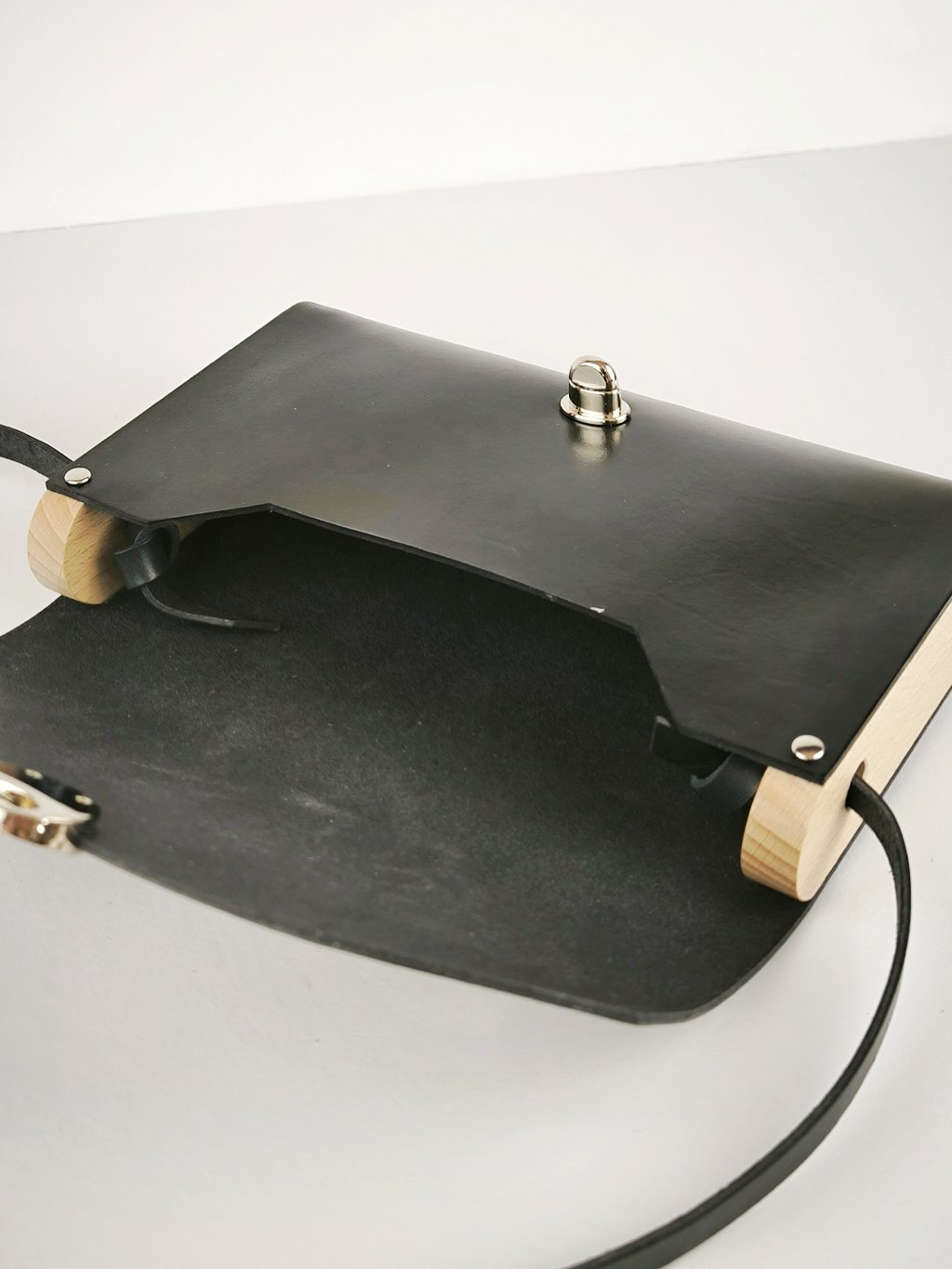 Tato stylová kabelka je vyrobena z velmi kvalitní a pevné hovězí kůže v černé barvě. Boky kabelky tvoří hladce opracované bukové dřevo, které jí dodává jedinečný vzhled a pevnost.