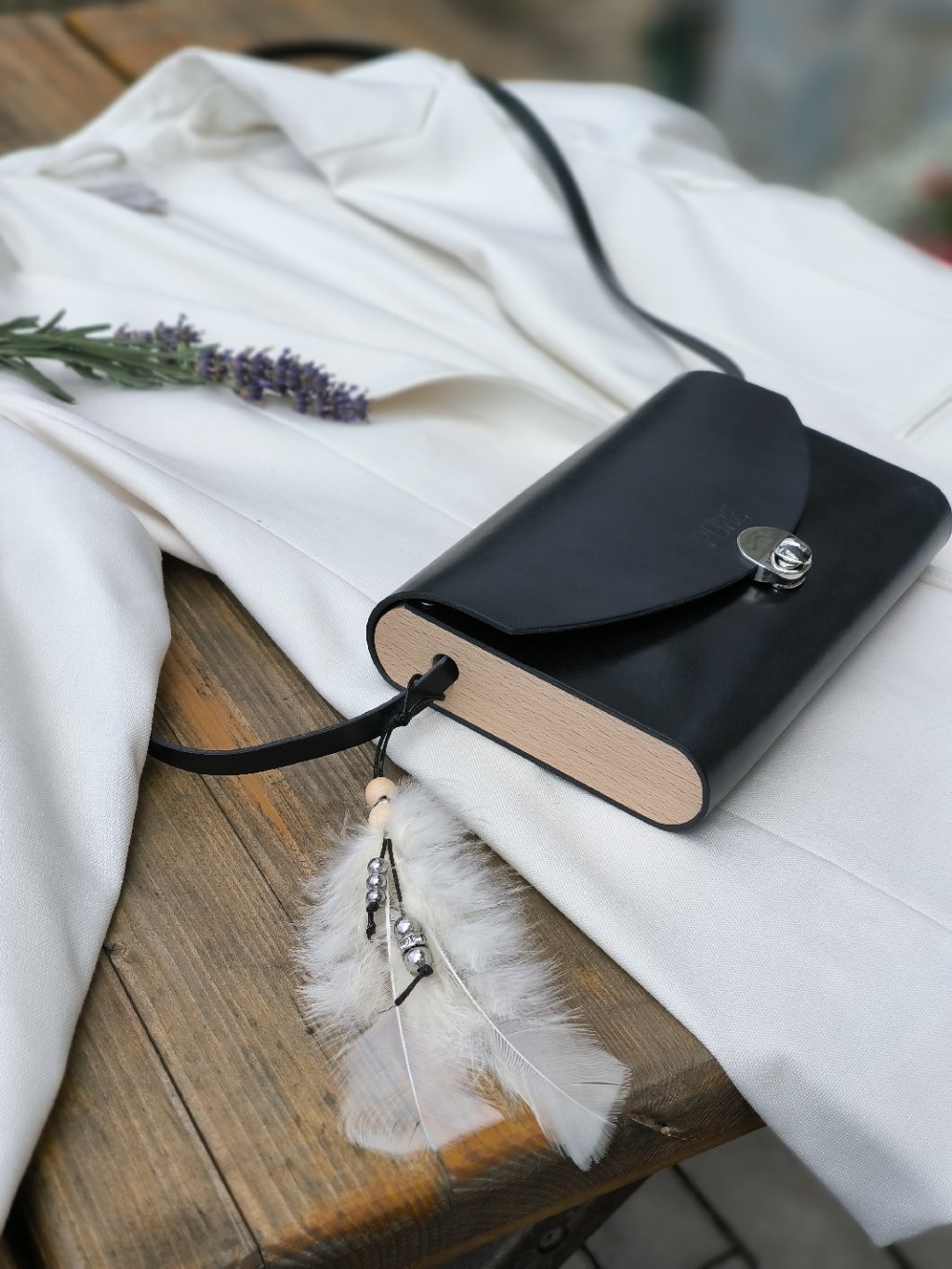 Malá kožená kabelka s bukovým dřevem + DÁREK přívěsek z peříček