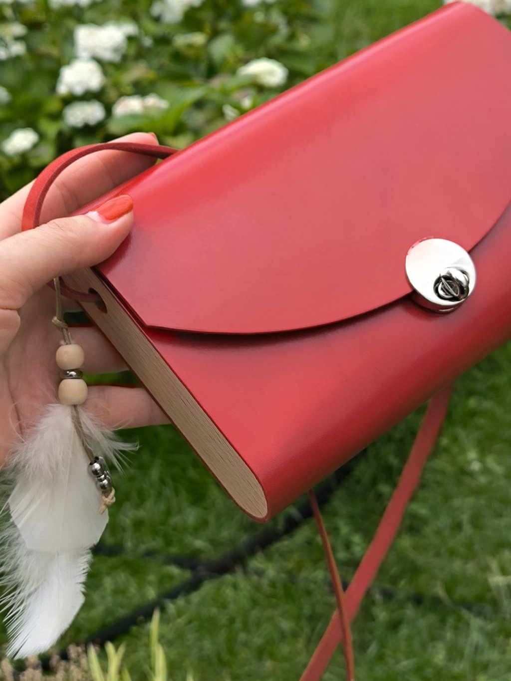 Malá kožená kabelka s bukovým dřevem + DÁREK přívěsek z peříček