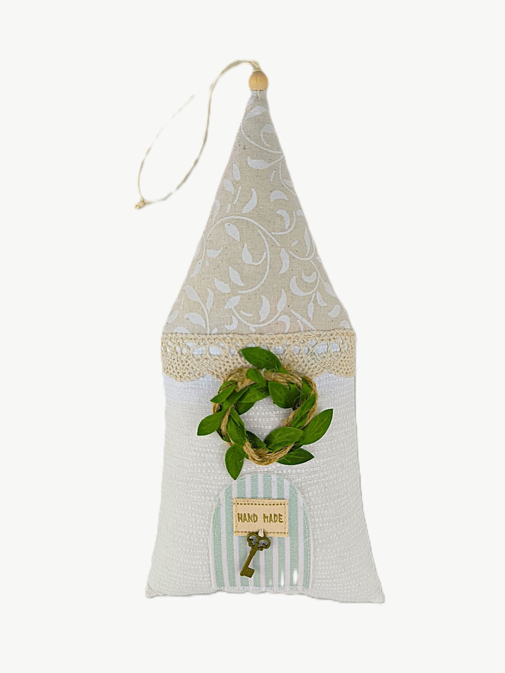 Domeček je ušitý z několika bavlněných látek, vnitřek je vyplněný dutým vláknem a je ozdobený kovovým klíčkem a věnečkem.