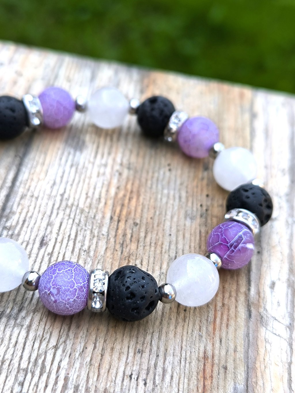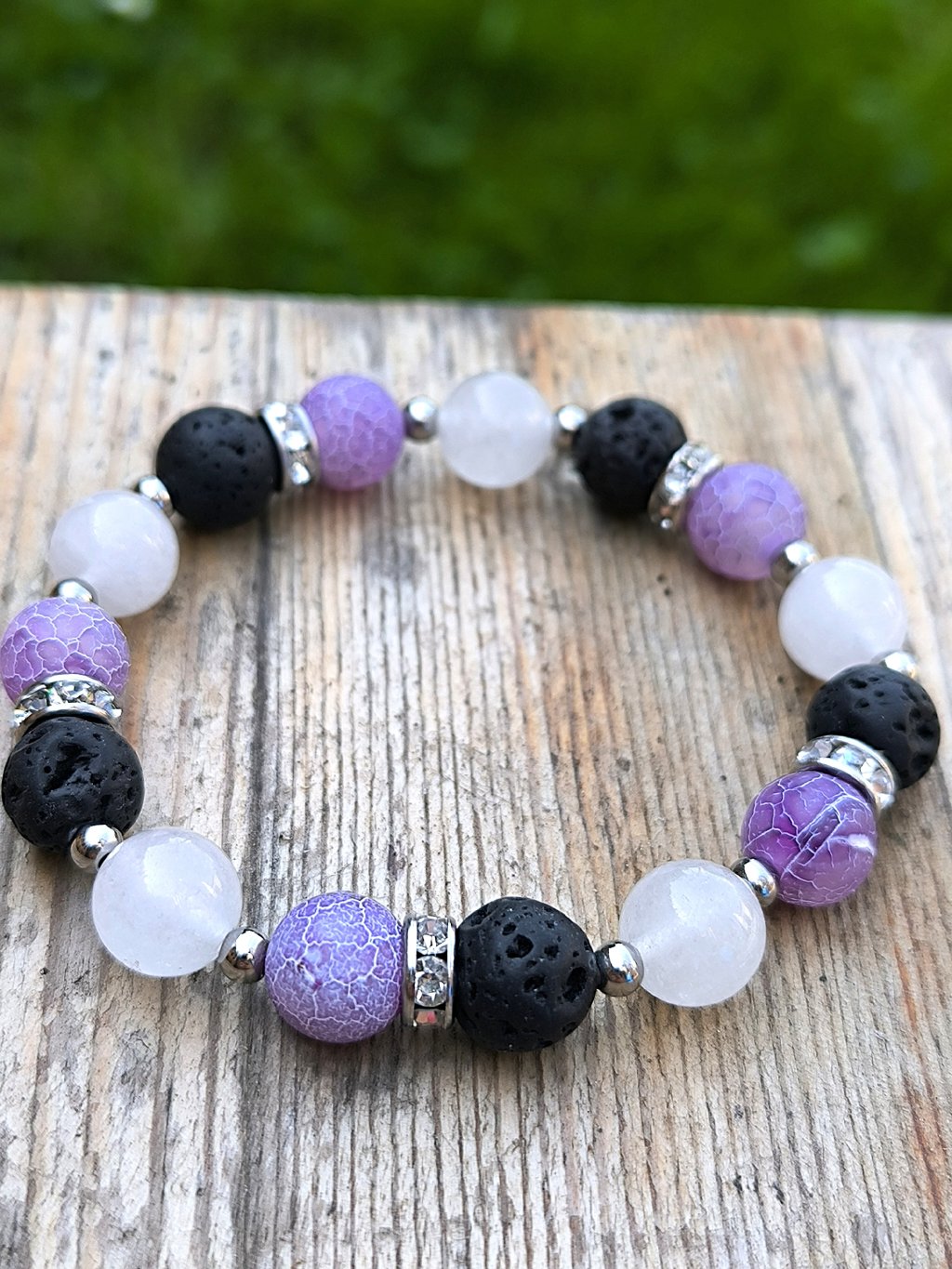 Tento ručně navlékaný náramek z minerálů má krásnou barevnou kombinaci černé, bílé a jemně fialové barvy. Je ozdoben komponenty z kvalitní nerezové oceli.
