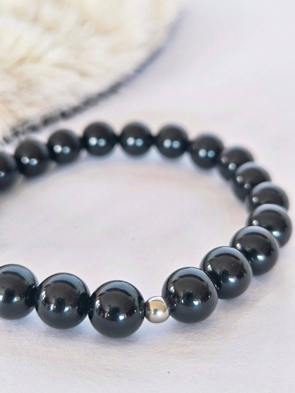 Náramek v oblíbeném minimalistickém stylu je ozdoben pouze malým korálkem z kvalitní chirurgické oceli. Jednoduchý, přesto stylový módní doplněk. Náramek je navlečený na pružném lanku, takže pohodlně padne na většinu zápěstí.