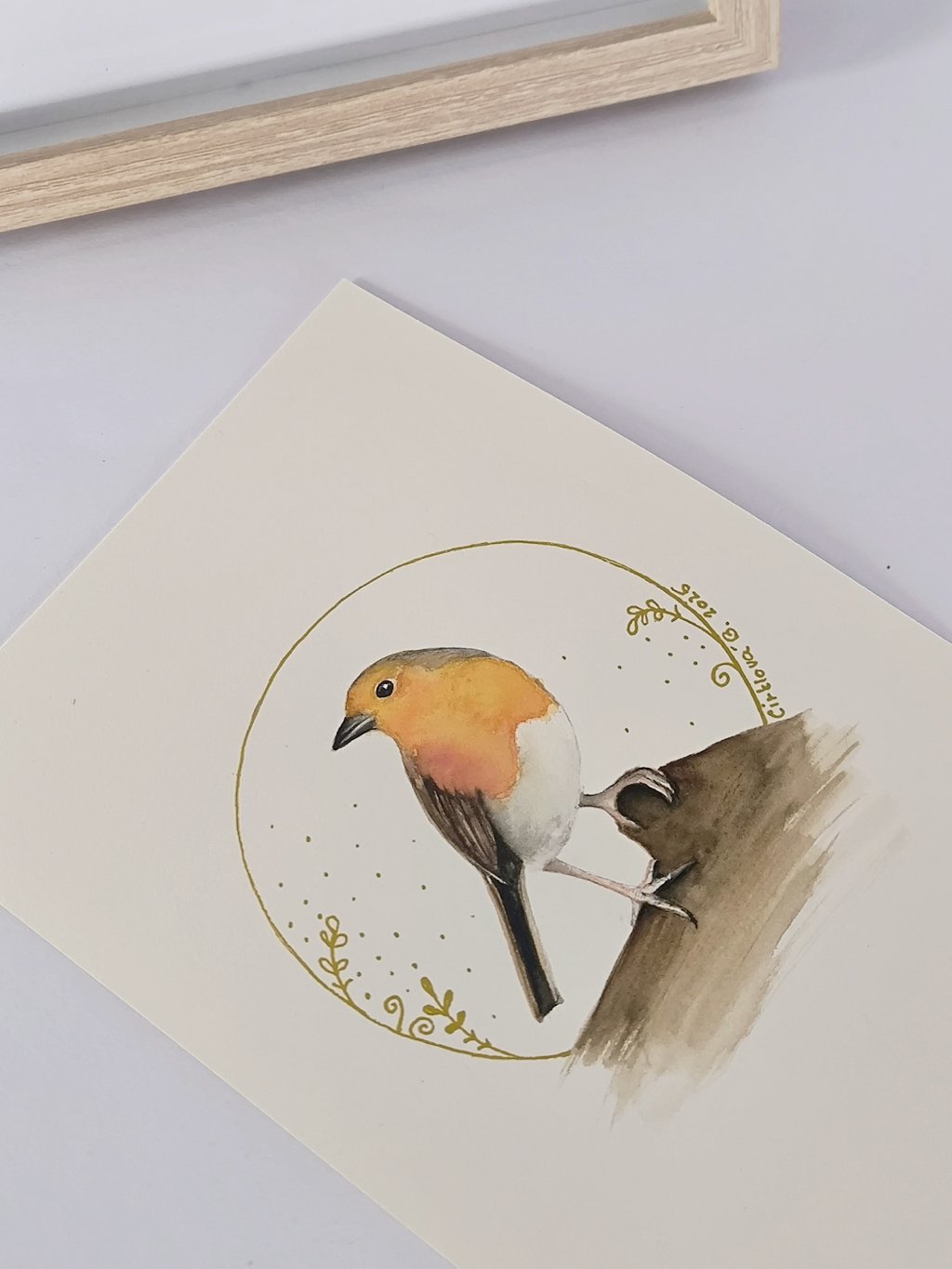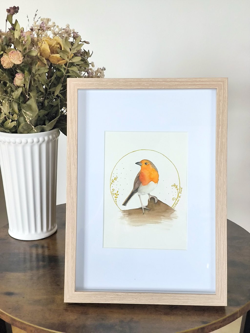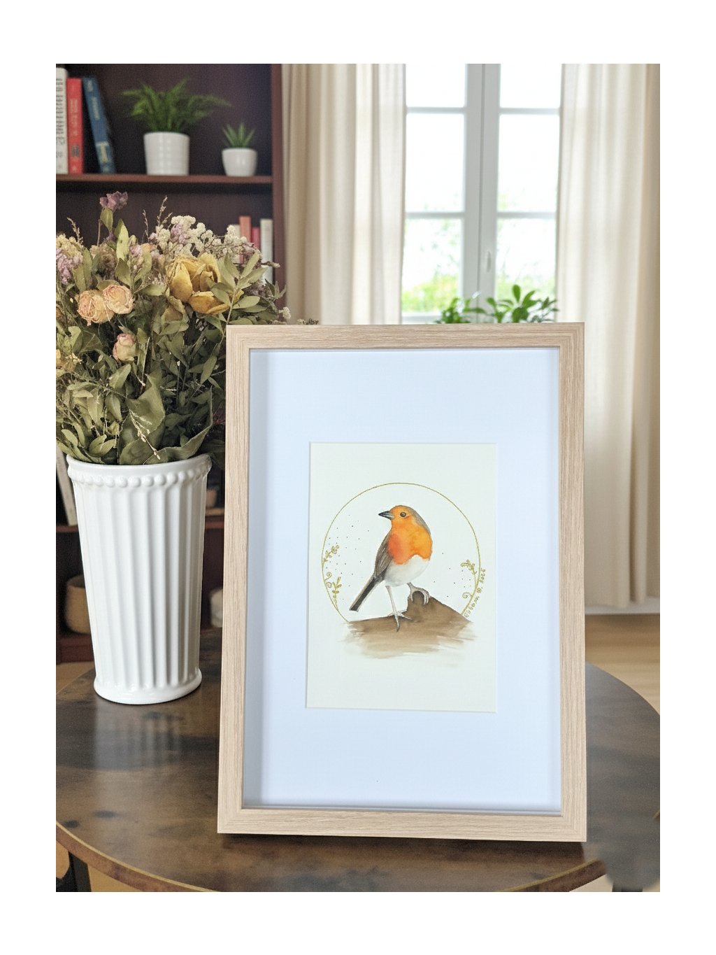 Jemný akvarelový obrázek malého ptáčka - červenky, kterého můžete zahlédnout v lesích, v parku, ale i na zahradě. Tento originální ručně malovaný obraz je zasazen do kvalitního dubového rámečku s paspartou se sklem.