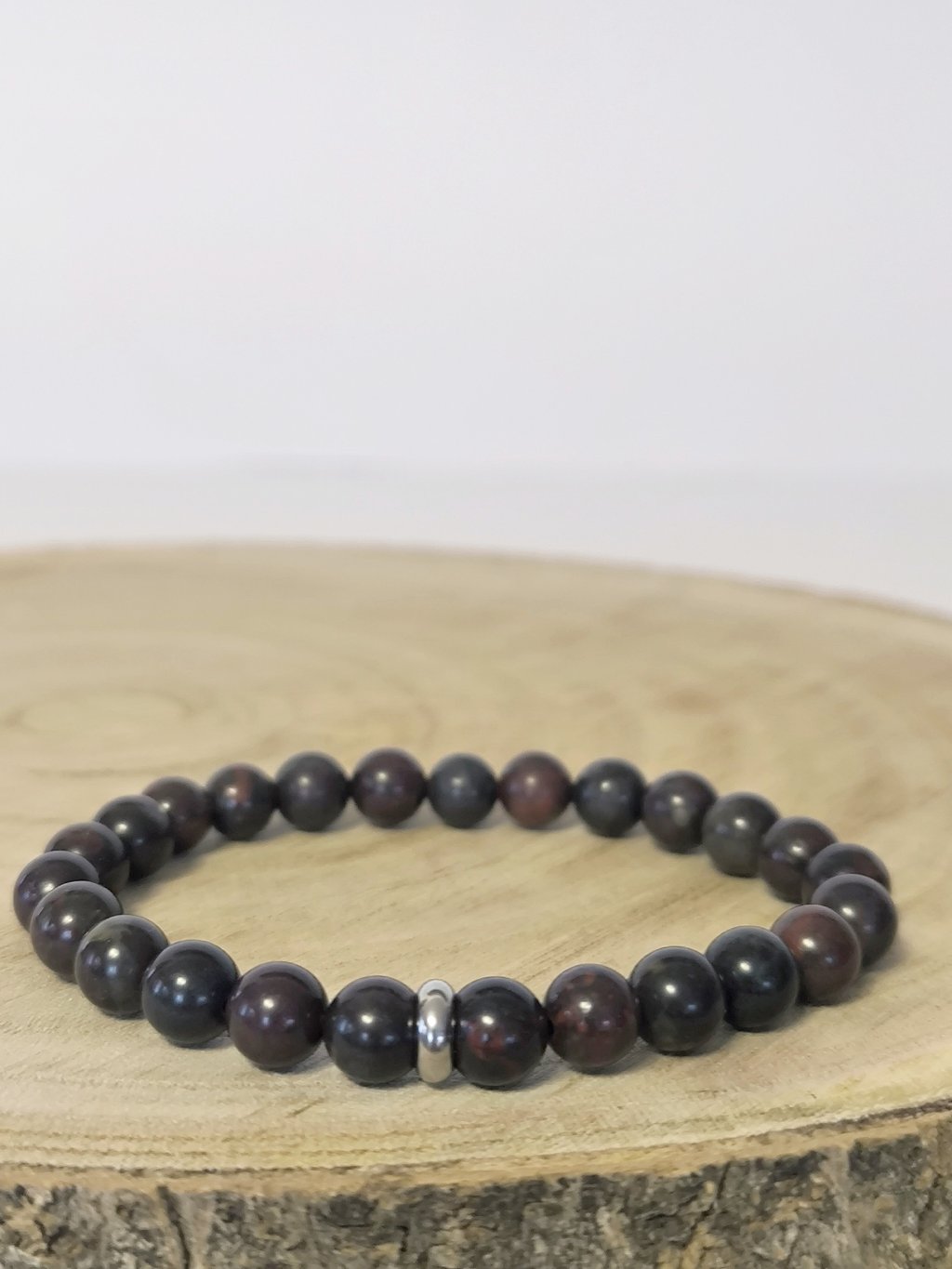 Pánský náramek z přírodního tmavě červeného jaspisu, známého jako „Dračí krev“, který tento název získal díky tmavě červené barvě připomínající krev. Každý korálek je unikátní, s jemnými tmavšími žilkami, které dodávají náramku autentický přírodní vzhled.