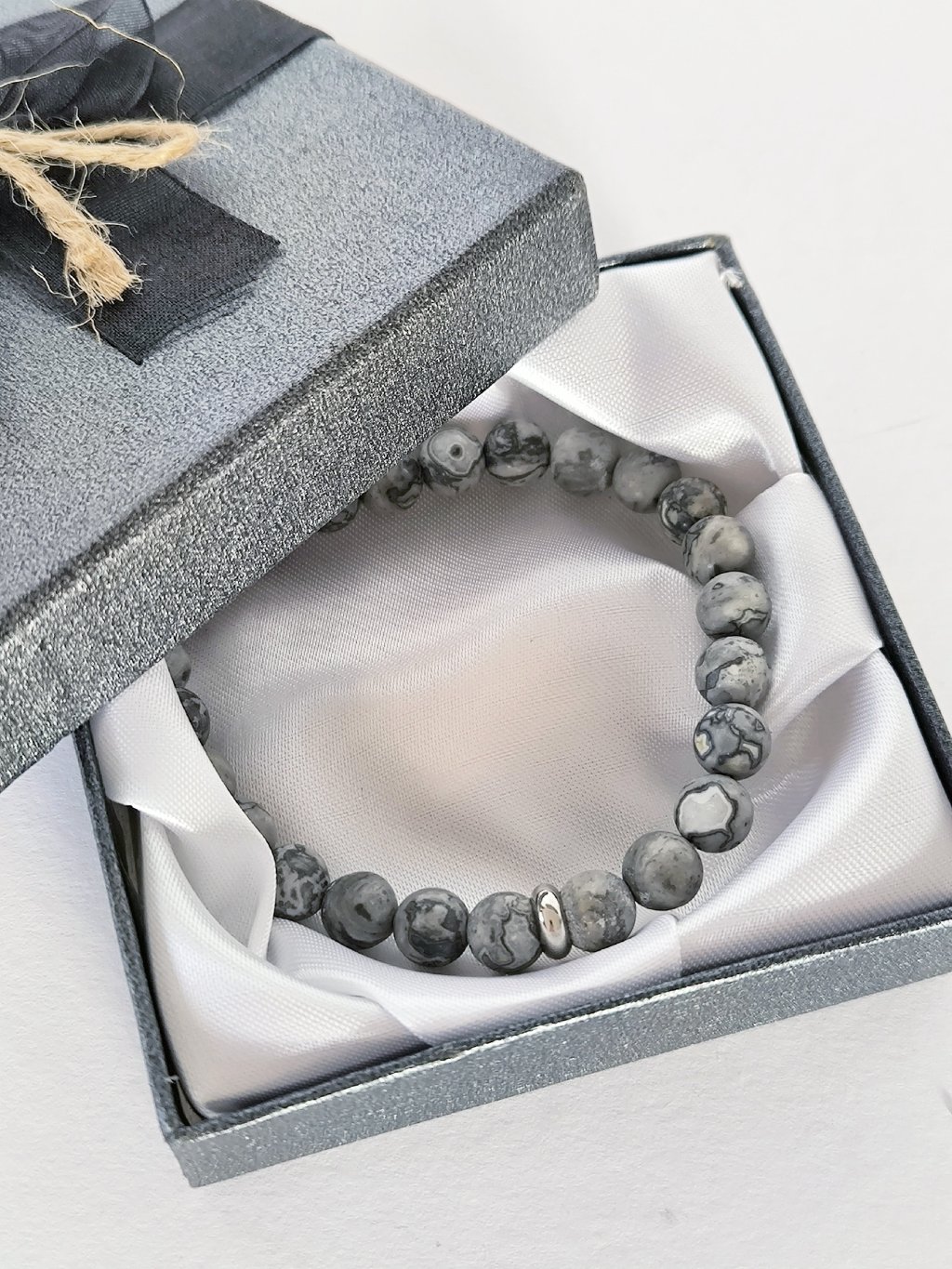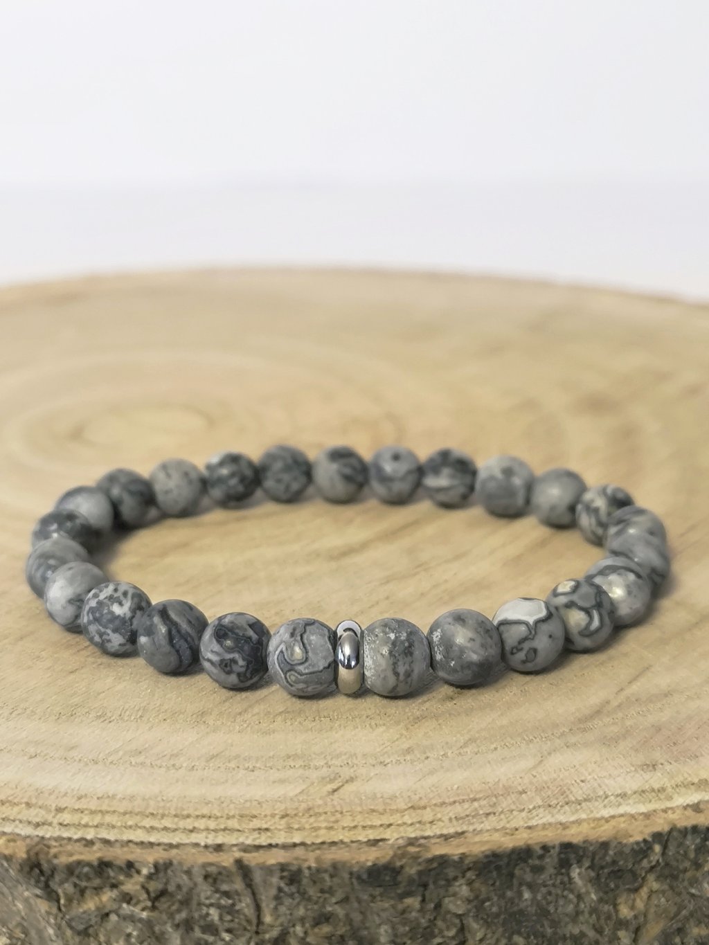 Pánský náramek z přírodního šedého jaspisu, korálky jsou v matném provedení. Šedý jaspis patří mezi oblíbené kameny pro svou nenápadnou, ale výraznou kresbu. Každý korálek je jiný – od světle šedých tónů až po tmavší odstíny s jemným žíháním. Díky tomu působí náramek elegantně a přitom zůstává univerzálním doplňkem pro každodenní nošení.
