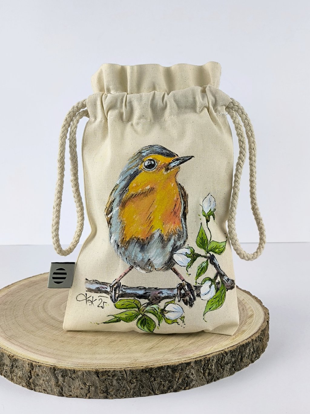 Přineste si malý kousek umění do kuchyně ručně malovaným bavlněným pytlíčkem s obrázkem malého ptáčka, kterého můžeze často zahlédnout v parcích a zahradách - červenky. V pytlíčku můžete uchovávat koření, bylinky, sušené houby nebo jiné drobnosti.