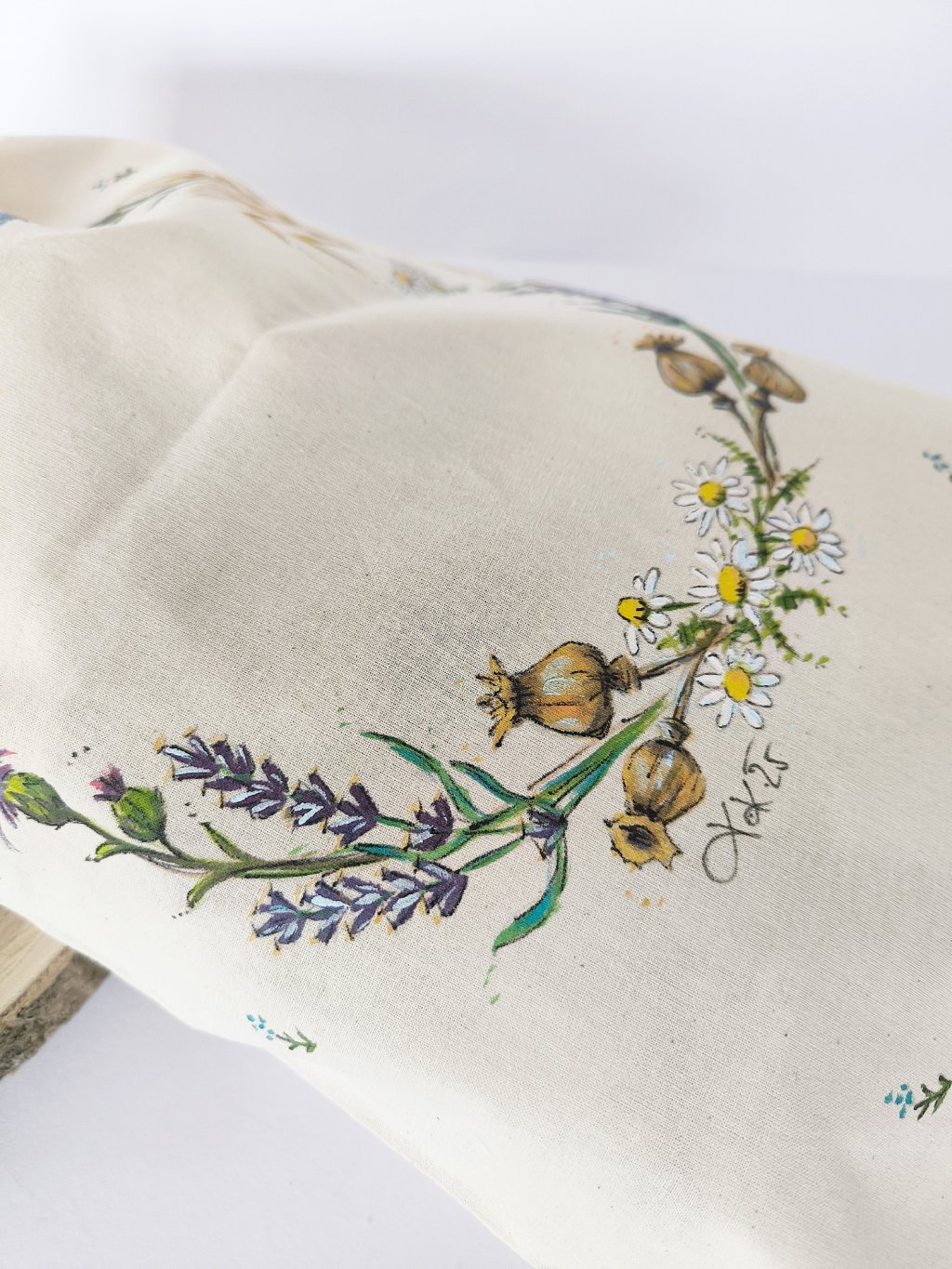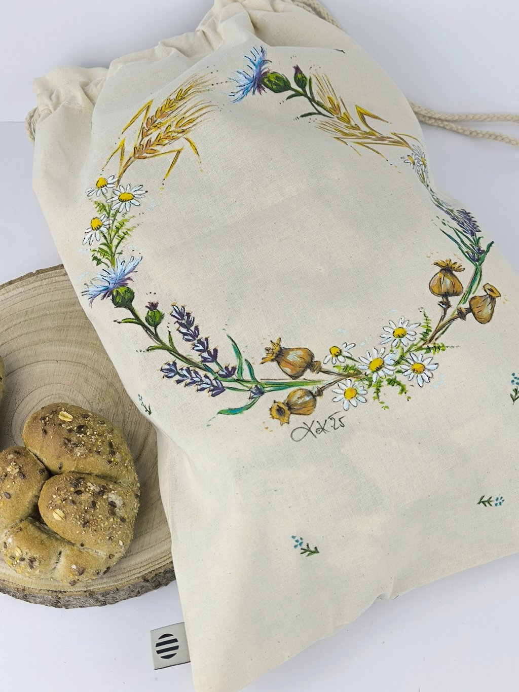 Ručně malovaný pytlík z bavlněného plátna na uchování pečiva jako jsou na rohlíky, bagety nebo menší chleba.