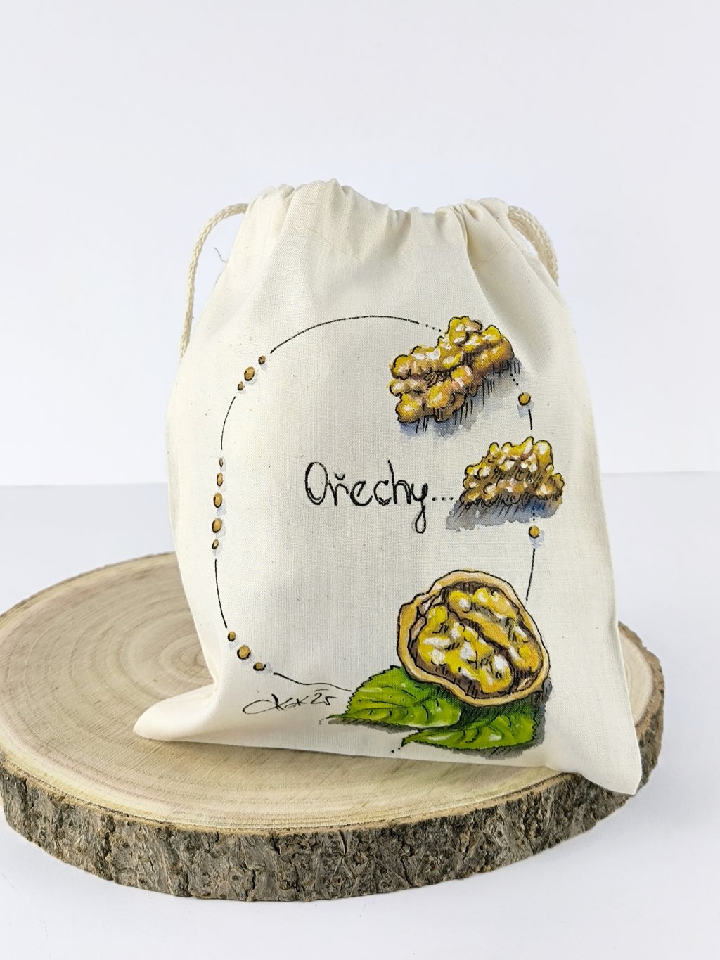 Uskladněte si ořechy v krásném ručně malovaném pytlíčku. Pytlíček je prodyšný a umožní ořechům dýchat, je ušitý z přírodní bavlny.