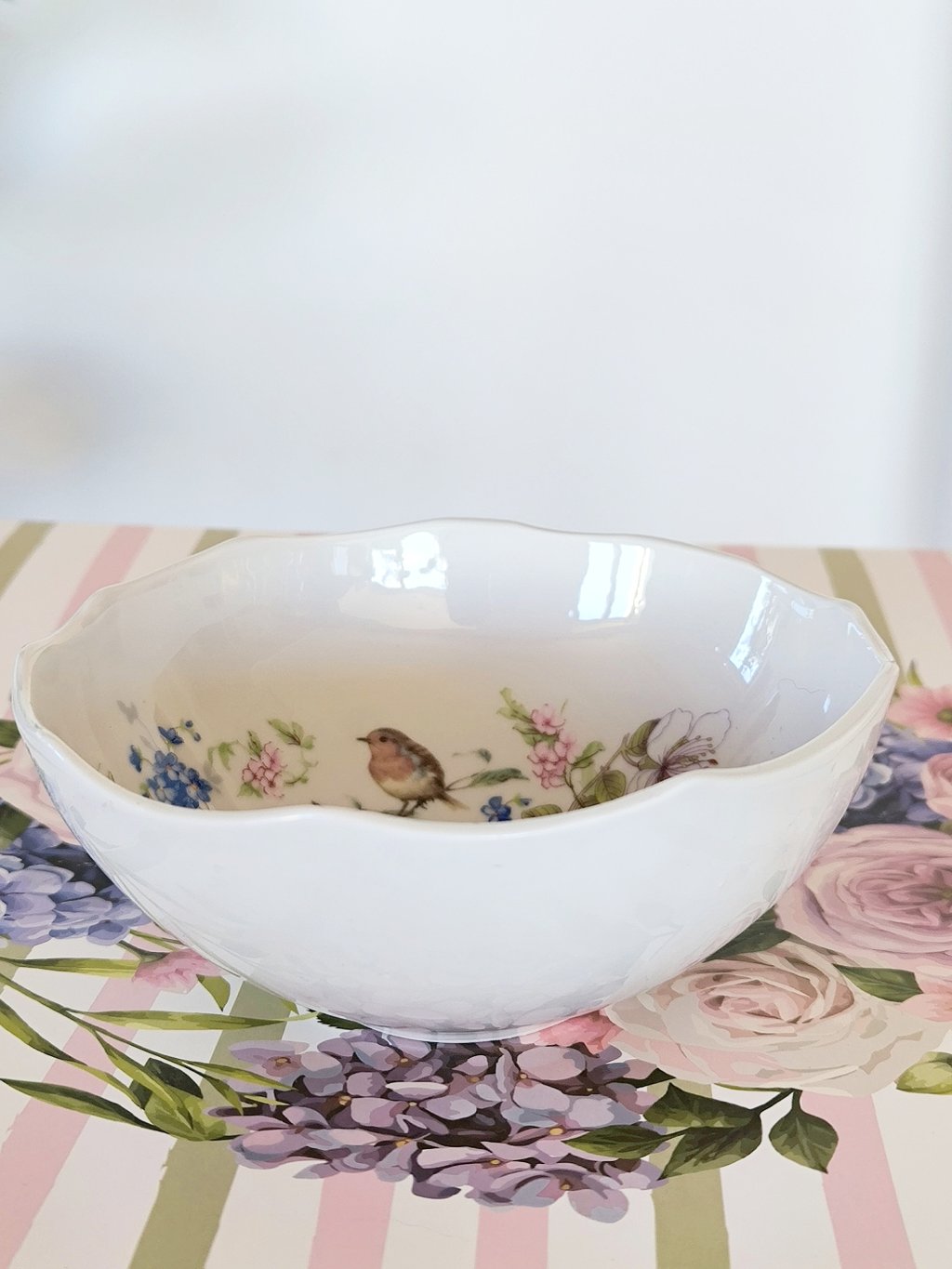 Ručně vyráběná porcelánová miska s květinami a ptáčkem pro romantické letní chvíle.