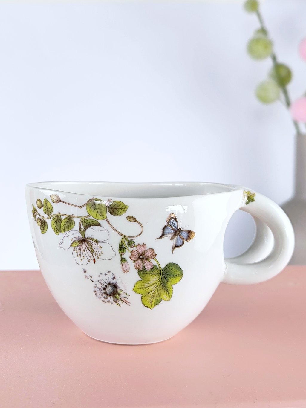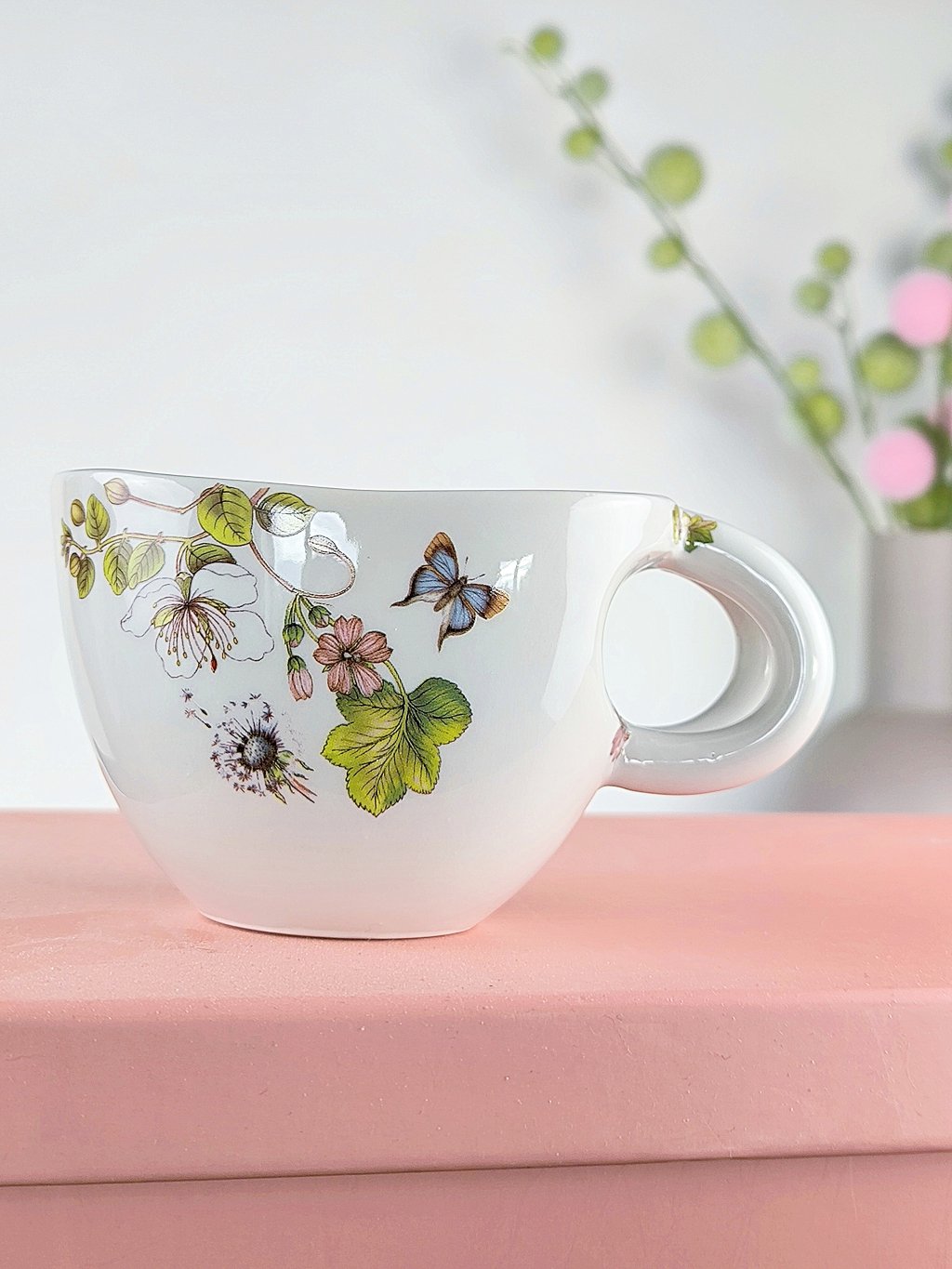 Krásný porcelánový hrníček s květinovým motivem, který je tak trochu neobvyklý a přesto je na něm něco, co běžně známe a používáme v kuchyni - kvetoucí rostlina jsou kapary :-)