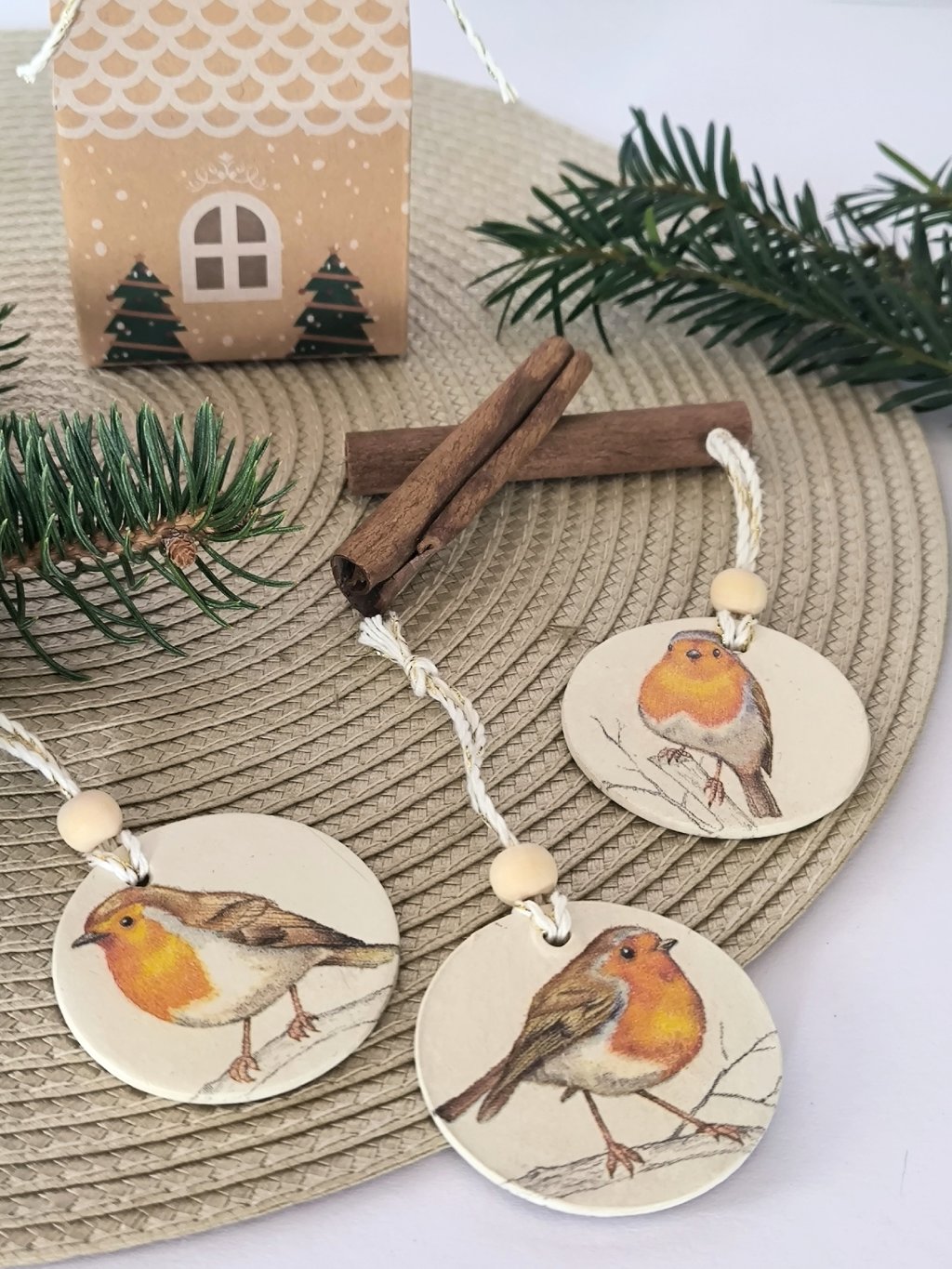 Zkrášlete si vánoční stromeček ručně vyráběnými ozdobami. Ozdoby jsou vyrobené z kerahmoty, zdobené ubrouskovou technikou decoupage. V sadě je 6 kusů ozdob a dostanete je v hezké dárkové krabičce z papíru ve tvaru domečku.