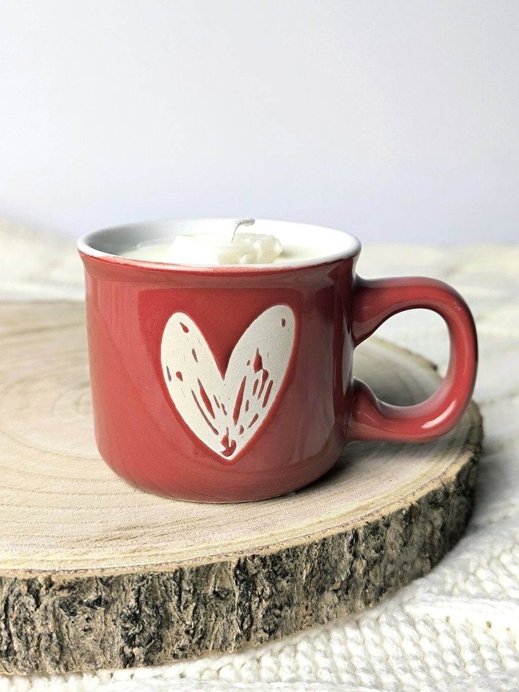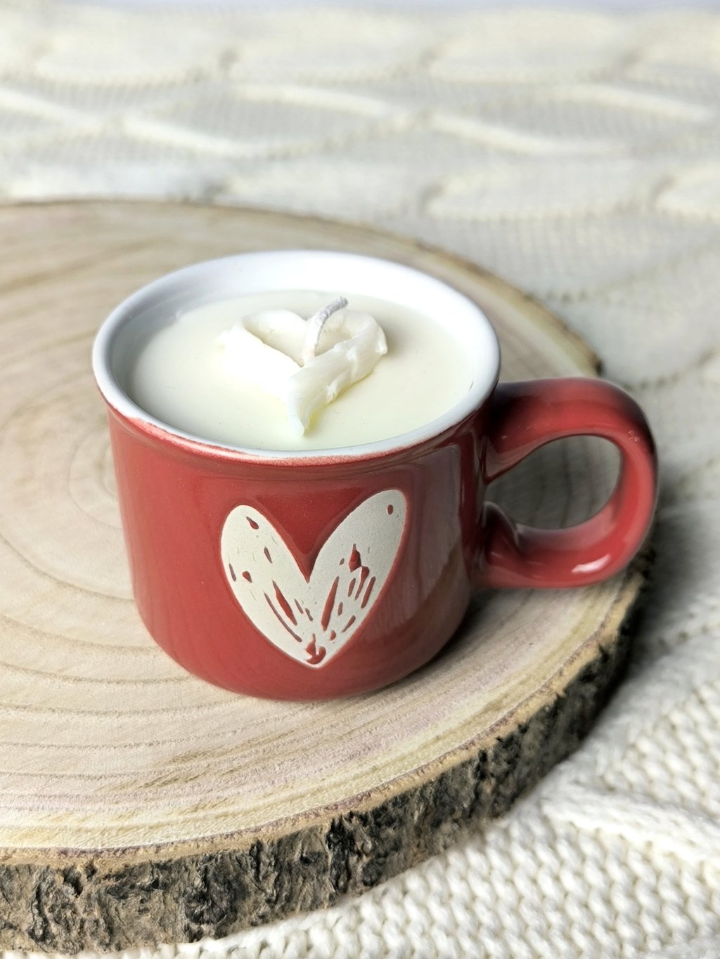 Ručně vyrobená svíčka v červeném hrníčku se srdíčkem