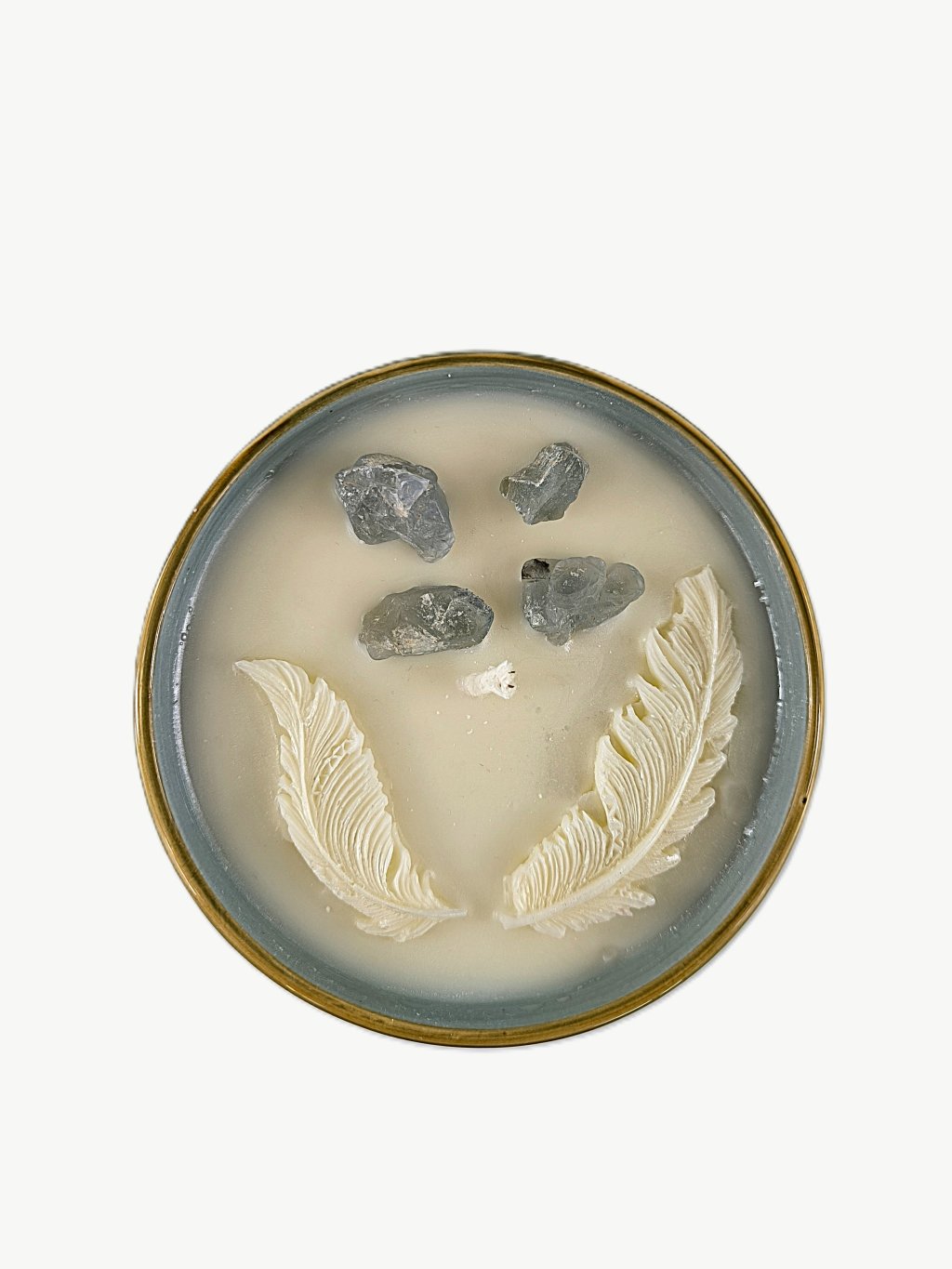 Svíčka je zdobená jemně vytvarovanými andělskými křídly z vosku a modrými kamínky - celestýny, které dodávají jedinečný duchovní rozměr.