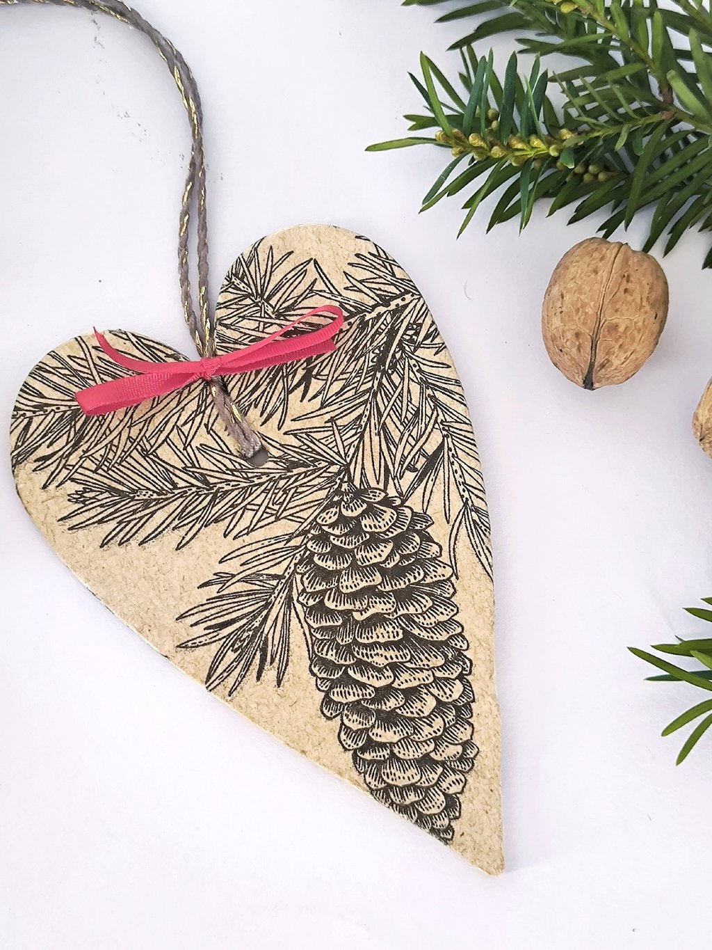 Přírodně laděná vánoční dekorace na stromeček nebo na zavěšení na okno či svátečního aranžmá. Ozdoba je ručně odlitá z kerahmoty a ozdobená ubrouskovou technikou decoupage s motivem šišky a malou červenou mašličkou.