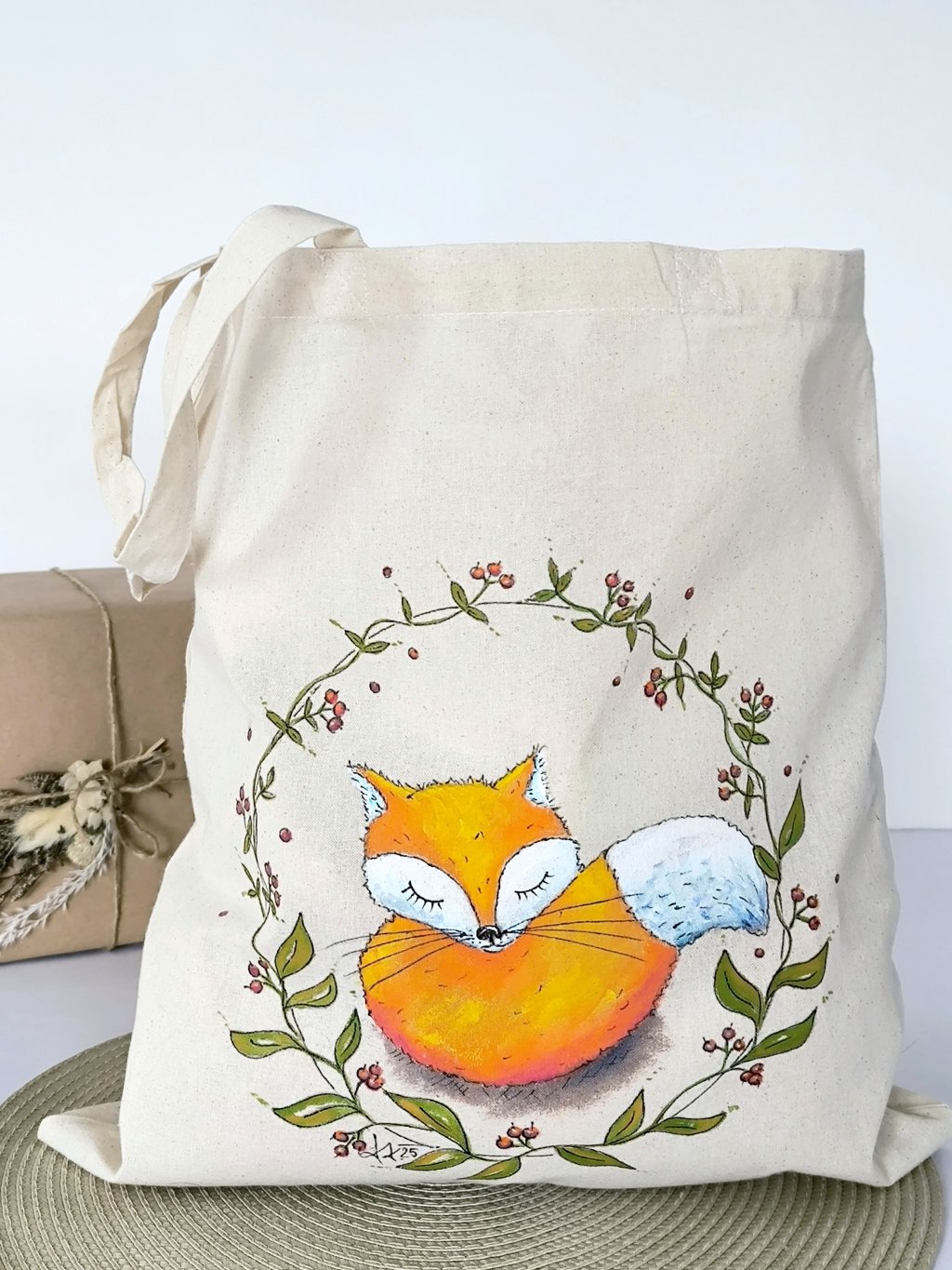 Darujte vánoční dárek svým blízkým originálně v ručně malované plátěné tašce s motivem spící lišky. Taška je ve velikosti nákupní tašky, takže ji obdarovaný využije i dále na uložení věcí nebo nákupy ve svátečním období.
