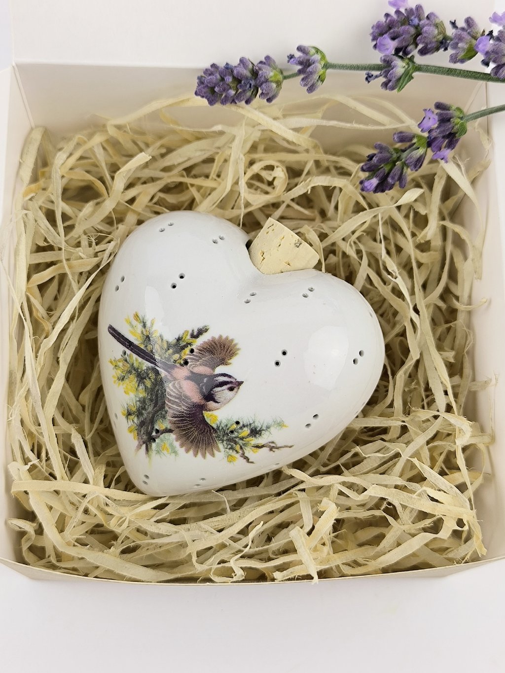 Voňavé porcelánové srdíčko plněné levandulí Ptáček