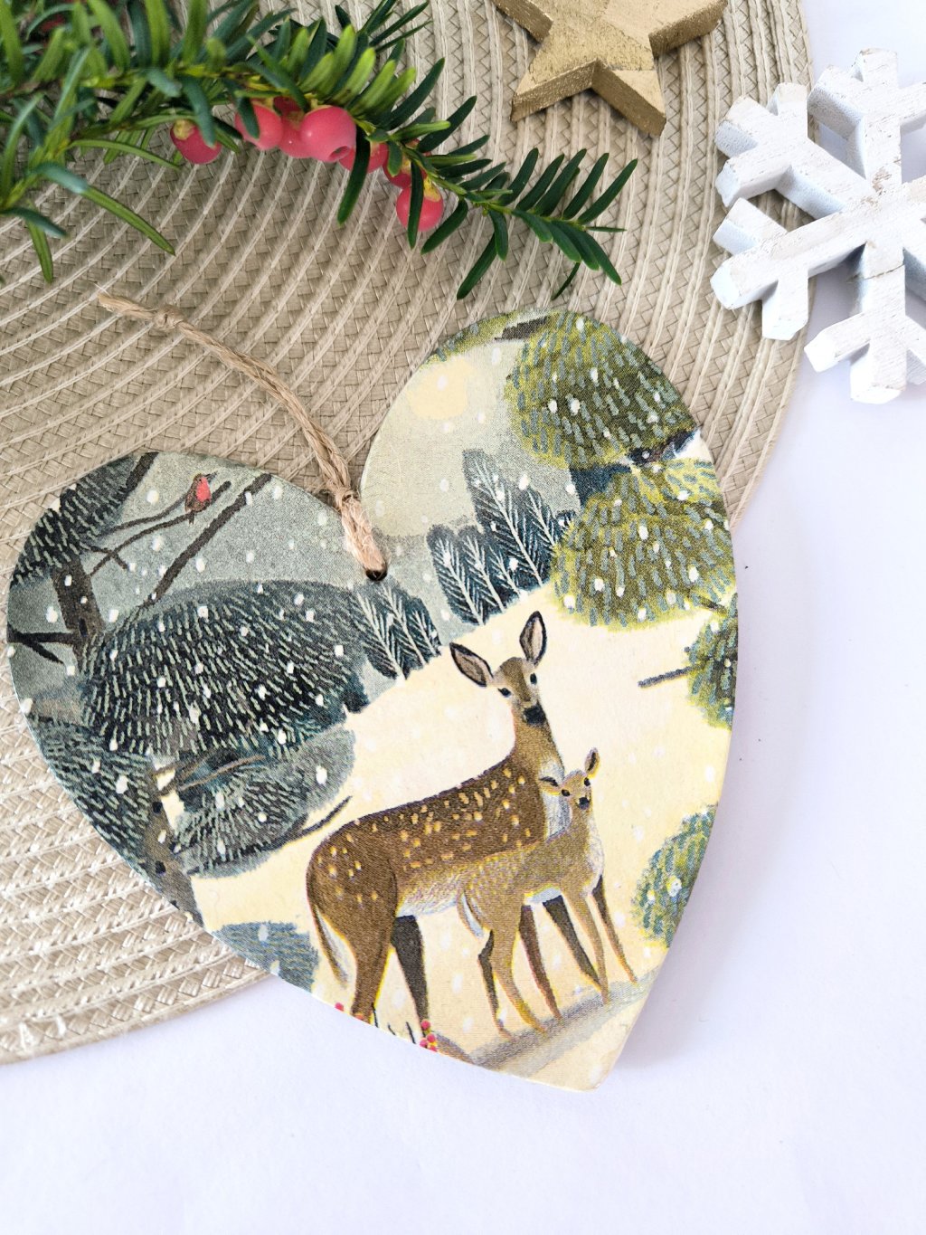Zkrášlete si zimní domov krásným ručně vyráběným srdíčkem na zavěšení se zasněženým obrázkem srnek v zimní přírodě. Srdíčko můžete zavěsit na vánoční stromek, větvičku nebo do svátečního aranžmá.